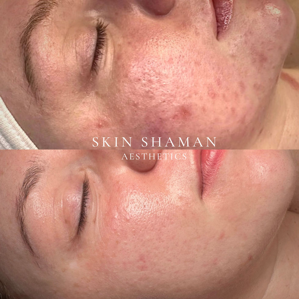 A collection of before and after skincare treatment comparisons, showcasing improved acne, texture, and visible scarring with the use of natural skincare products and professional facial treatments.